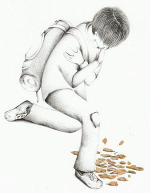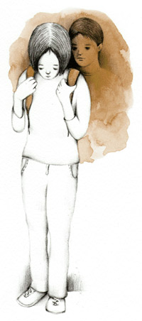 影子靜靜地站了起來。是個年輕男子。瀏海長到蓋住眼睛,臉型略長,溫柔的眼眸中透露著疑問。他身穿洗得褪色的T恤、膝蓋破洞的牛仔褲,腳踩磨損的運動鞋,腳邊放著一個大背包。